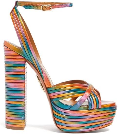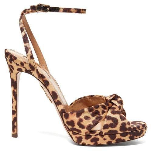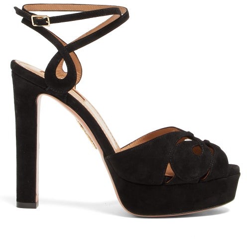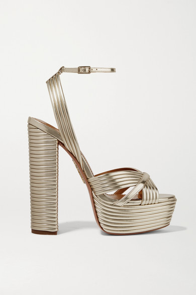 Aquazzura - Aquazzura’s gold Sundance sandals tap a glamorous 1970s mood. Made in Italy, they’re crafted from laminated metallic leather that’s wrapped around the open-toe silhouette to a piped effect with a slender ankle strap and raised to a high block heel resting on a platform sole – a key trend for the new season. Pair them with a sequinned dress for a retro-inspired evening edit.