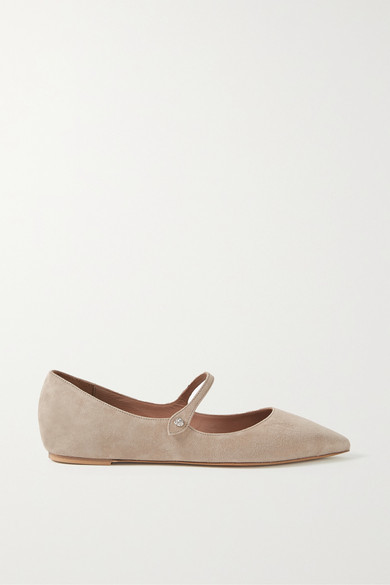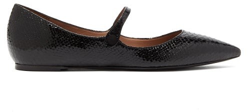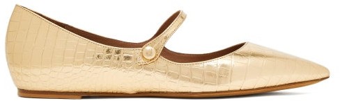 Tabitha Simmons - Tabitha Simmons's red Hermione Mary-Jane flats will bring a hint of vibrant allure to your daytime edits. Made in Italy from tactile crocodile-embossed leather, the point-toe silhouette rests on a demure black stacked heel, lined in rich tan leather. Wear them to complement the flashes of red in a printed dress.