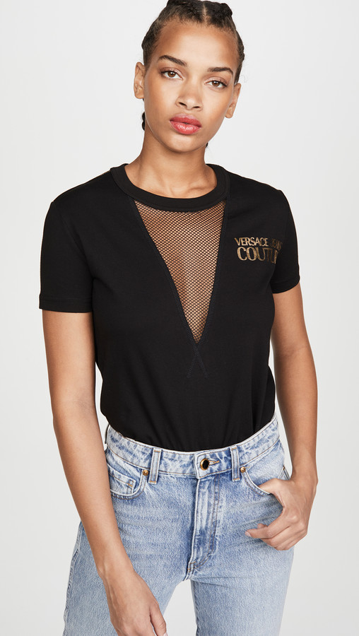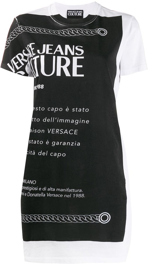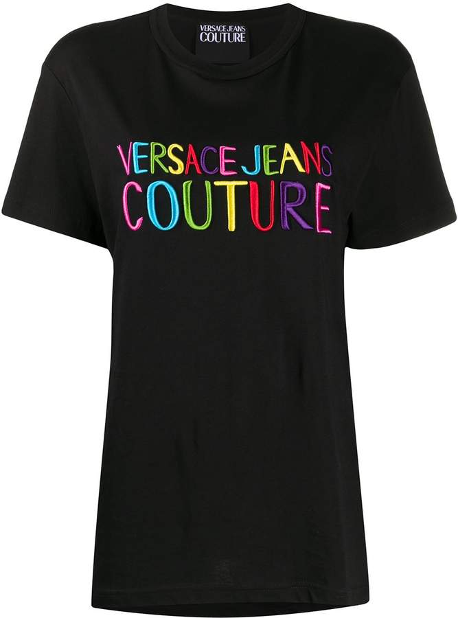 Black cotton Barocco logo-print T-shirt from VERSACE JEANS COUTURE featuring a multicoloured print, a logo to the chest, a ribbed crew neck, short sleeves and a straight hem.